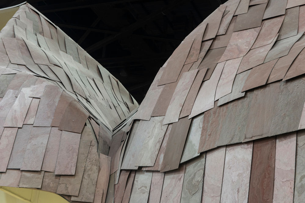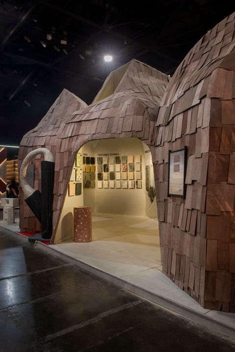 Inside, the soft fabric-clad surfaces provide a warm contrast to the robust stone veneer exterior, reinforcing the design’s connection to natural materials. This architectural approach masterfully integrates form, light, and material, resulting in a sculptural, functional environment that elevates the visitor experience and showcases exceptional craftsmanship and innovative design.